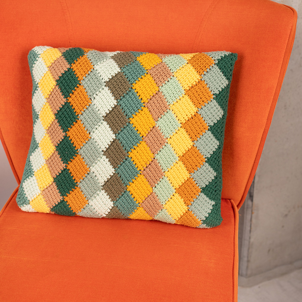 The Wallis cushion is a tunisian crocheted cushion. If you ever wanted to give tunisian crochet a go, this is your project! The tunisian entrelac stitch can be made using your own ‘normal’ crochet hooks, so no need to go shopping for new hooks. I do always get a bigger hook, because this stitch tends to become too tight. For a tutorial on tunisian entrelac stitch have a look here.